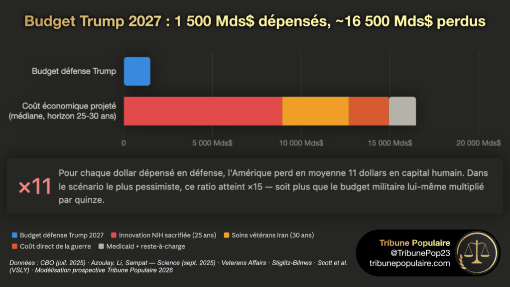 Le coût économique total de cette politique calculé en capital humain perdu, en soins non prodigués, en innovation thérapeutique sacrifiée, en productivité détruite et en guerres payées pendant trente ans s’établit selon nos projections entre 3 000 et 5 800 milliards de dollars dans le scénario le plus clément, et entre 9 700 et 23 000 milliards dans le scénario pessimiste de guerre prolongée. Soit, dans ce dernier cas, un ratio de 1 pour 15 par rapport au budget militaire initial. Pour chaque dollar dépensé en missiles et en frégates, l’Amérique en perdrait quinze en capital humain, en recherche non faite, en maladies non soignées, en guerres qui n’en finissent pas de se payer. Aucun analyste financier n’accepterait un tel rendement. Aucun conseil d’administration ne validerait un tel projet. Mais un Congrès, apparemment, si.