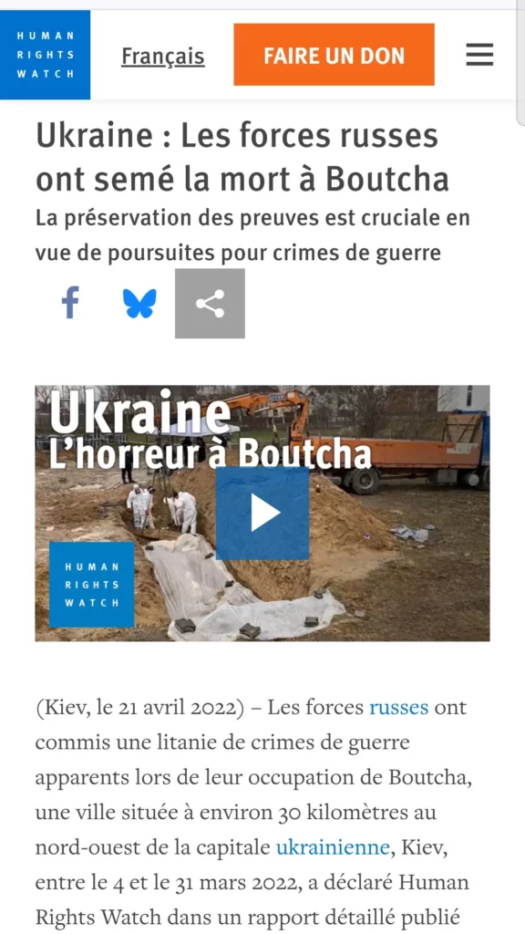 « Les images de Butcha ont servi à conforter la thèse d’un ennemi monstrueux, alors que toute remise en question, même argumentée, était traitée comme de la propagande pro-russe ». Il est à noter que l’enquête confiée à la Gendarmerie française a abouti à un rapport qui est resté secret alors qu’il aurait bien entendu été rendu public et médiatisé s’il était accablant contre les Russes.