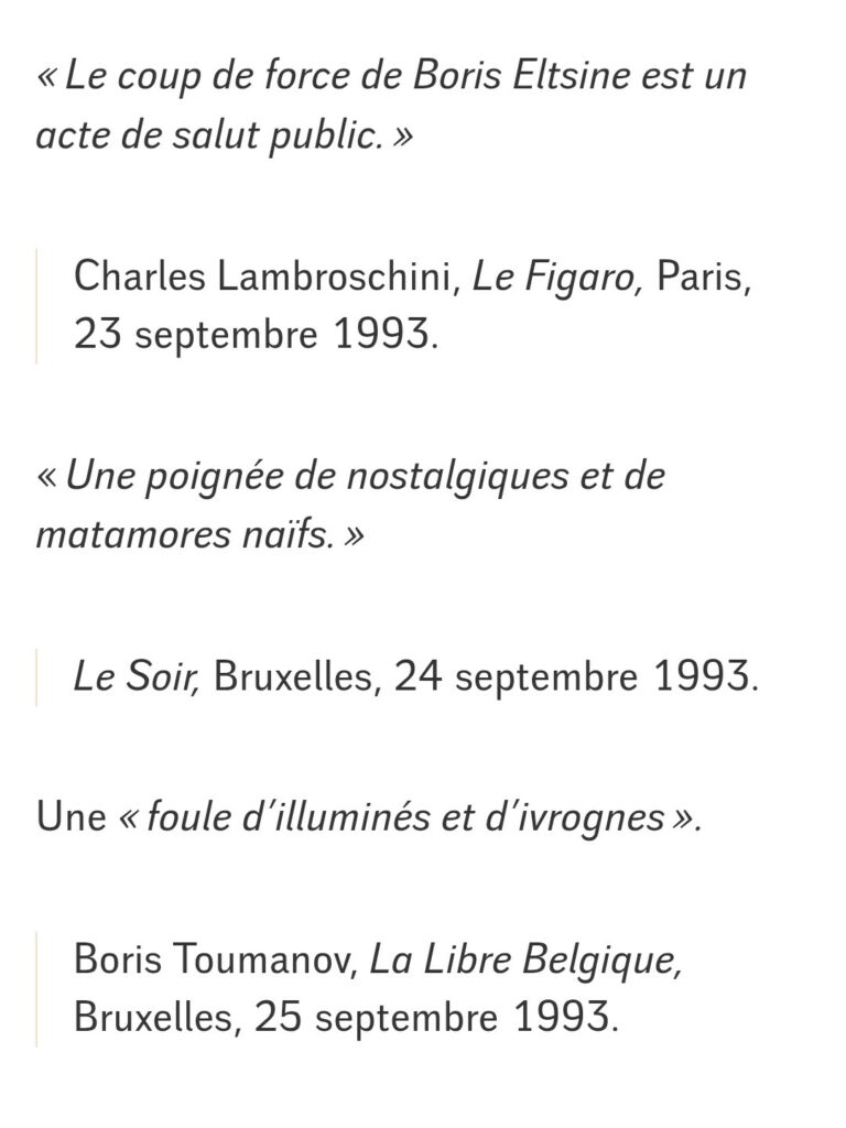 La presse occidentale — telle que le New York Times, Le Figaro, ou The Washington Post — reprend largement la rhétorique selon laquelle la violence d’Eltsine était une sorte de mal nécessaire, une purge imposée pour empêcher le retour du communisme. Par exemple, certains éditoriaux saluaient la « victoire de la démocratie » tandis que les médias minimisaient souvent l’ampleur des pertes humaines ou les représailles sévères contre les opposants.